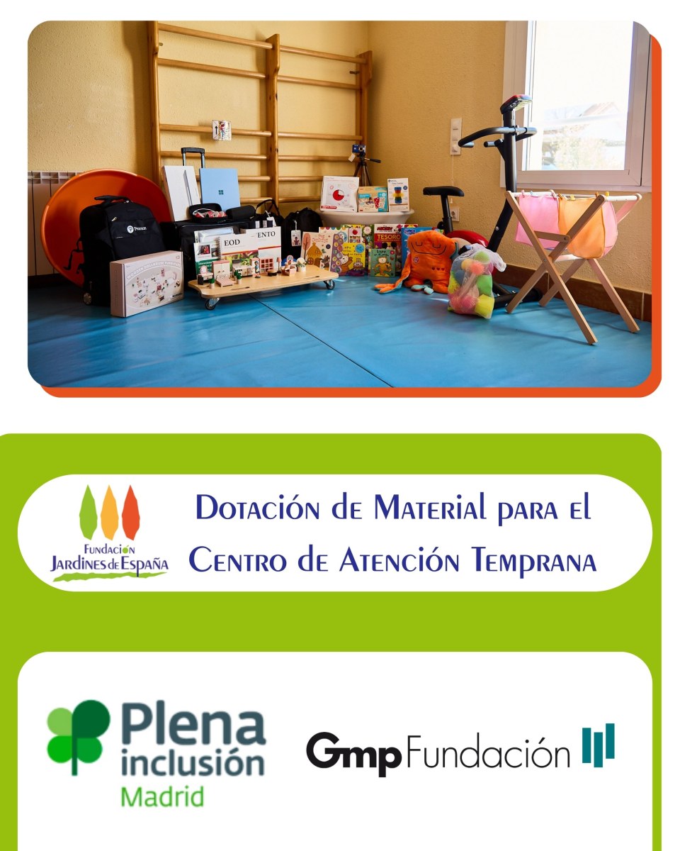 Nuestra Entidad ha ejecutado con éxito el proyecto Dotación de material para el Centro de Atención Temprana Jardines de España, financiado con una subvención de 7.000 euros otorgada por GMP, dentro de la convocatoria Tiempo de Renovar impulsada por Plena Inclusión Madrid.